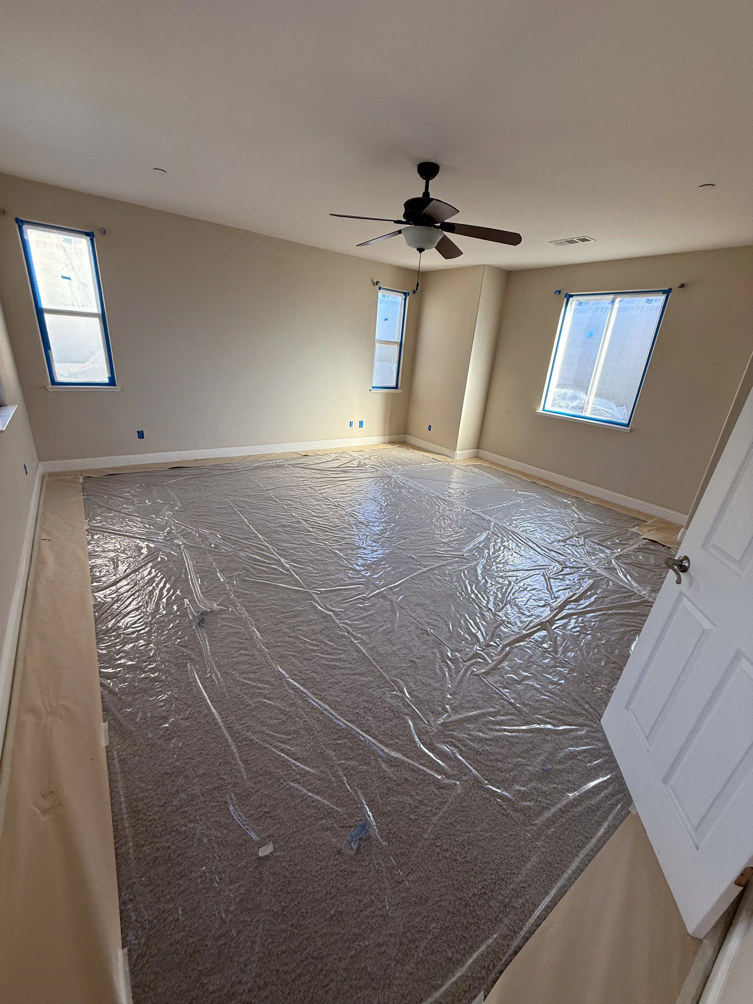 Meticulous masking/covering of items not to be painted. Clean surfaces. Repair any imperfections like holes or cracks, caulk gaps, and prime where needed for a durable and cosmetic final result.